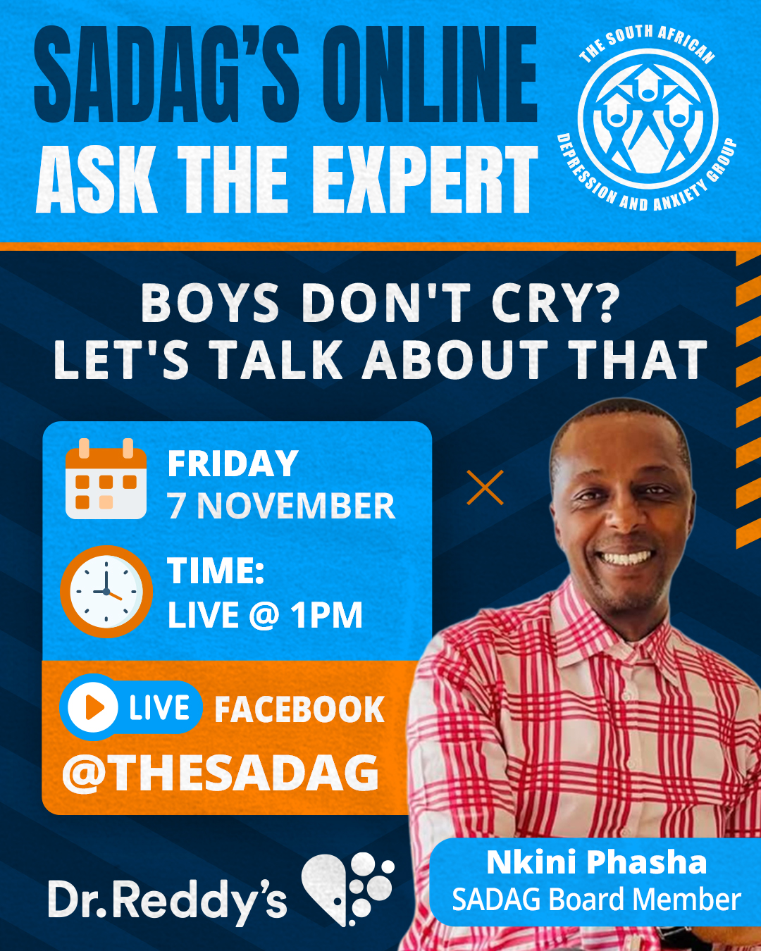 This November, SADAG calls on men across South Africa to be “Strong Enough to Talk”. We want men to know that real strength is found in speaking openly, reaching out when they are struggling, and supporting one another through life’s challenges. Wear blue this month to show your support for Men’s Mental Health, a colour that represents honesty, calm, and the courage to have real conversations. Help raise awareness by joining our online activities and spreading the message by sharing our posts throughout the month. Explore our toolkit for practical resources that make it easier to start real conversations, build connection, and guide men toward the help they need.